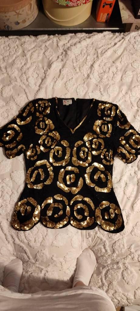 This perfectly splendid Stenay black and gold bedazzled floral top features:
